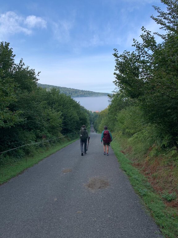 <Das wichtigste Wahrzeichen dieser Etappe ist der Alto del Perdón, obwohl der Aufstieg nicht ohne ist, mit einem Höhenunterschied von 260 Metern. Der Abstieg ist etwas schroffer, ziemlich steinig und daher etwas rutschig. Oben angekommen müssen wir eine kurze Pause einlegen, um die Aussicht zu genießen. Es ist ein ziemlich windiges Gebiet, daher finden wir auf dem Gipfel nicht nur das Pilgerdenkmal, sondern auch die Gesellschaft von Windmühlen.