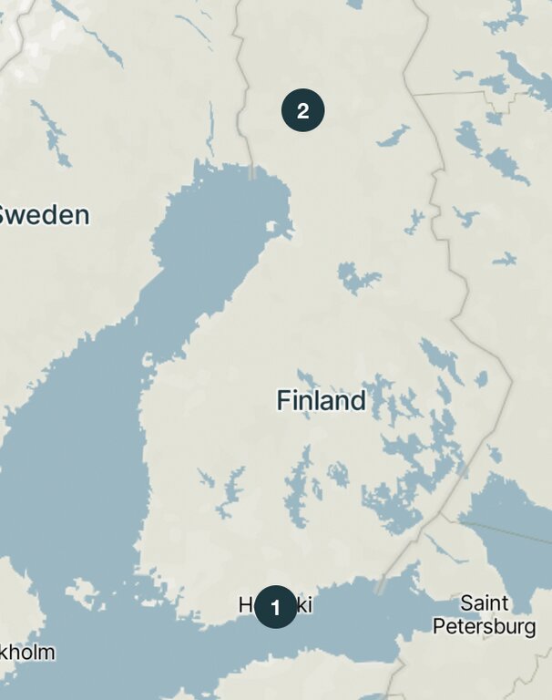 Diese Reise beinhaltet unvergessliche, exklusive Übernachtungen und Besuche einiger der beeindruckendsten Winterziele Finnlands. Sie beginnt in Helsinki, einer lebendigen und modernen Hauptstadt an der Schnittstelle von Ost und West. Von Helsinki reisen die Teilnehmenden nach Norden nach Rovaniemi, die arktische Stadt im Herzen Lapplands und offizielle Heimat des Weihnachtsmanns. Die Tour umfasst einen dreitägigen Aufenthalt im Wilderness Resort Vaattunki.