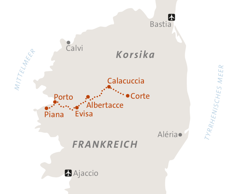 Die Anreise nach Corte und von Piana kann bequem mit öffentlichen Verkehrsmitteln organisiert werden. Bitte beachten Sie eventuell eingeschränkte Fahrpläne an Feiertagen. Sonntags fahren teilweise keine öffentlichen Verkehrsmittel (speziell Busse). Fahrplan unter: https://www.corsicabus.org/busAjaccio/AJA_Cargese_Po.html