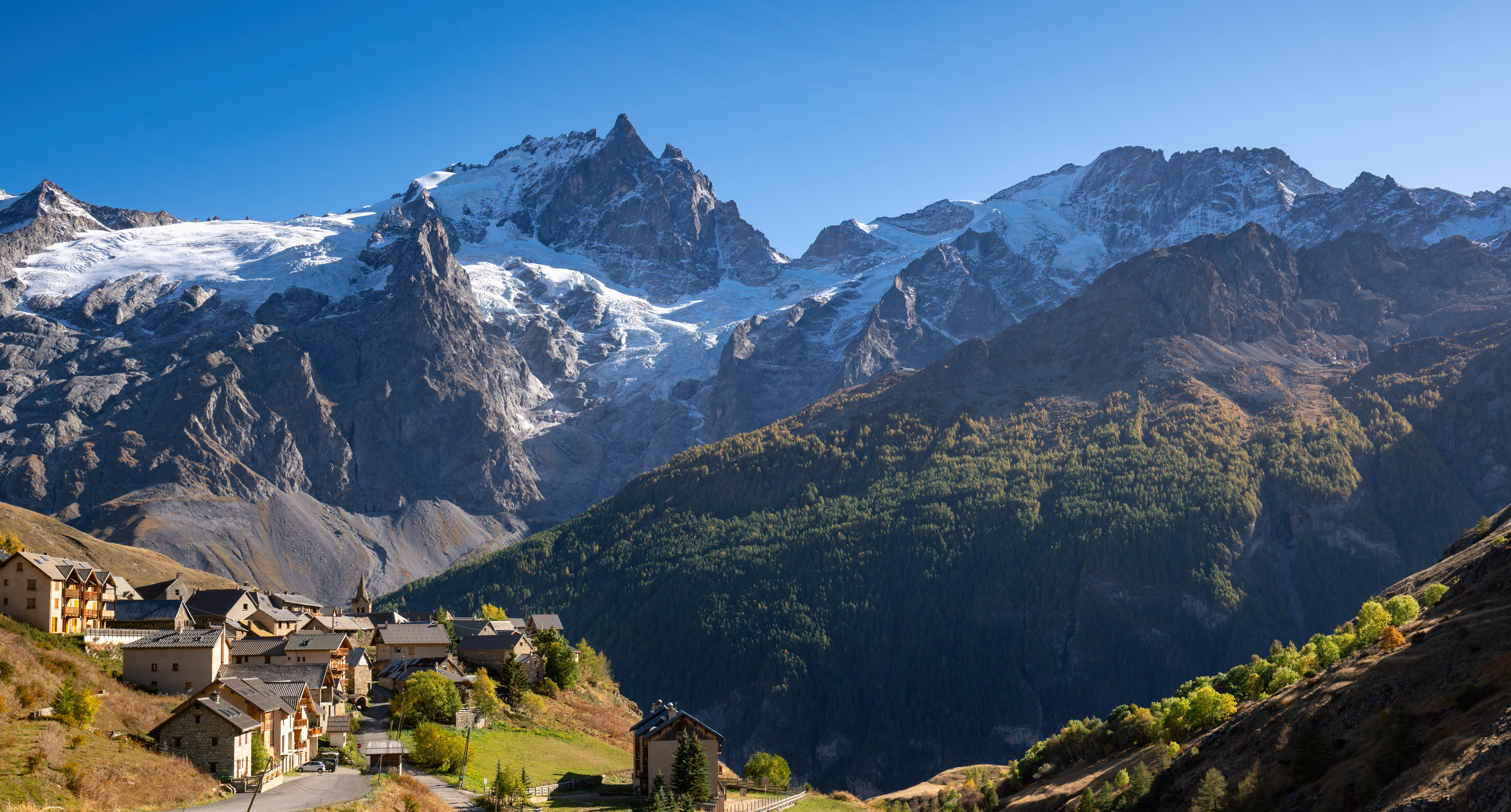 <Der Glanz der Gletscher der Meije und seines Nachbarn Rateau wird Sie während des ganzen Tages verzaubern. Sie verlassen das friedliche Maurian Tal und steigen zum Dorf Valfroide ab. Ein schöner Aufstieg durch den Lärchenwald führt Sie zum Aussichtspunkt Aiguillon (2095 m), von dem aus Sie einen beeindruckenden Blick auf die großen vergletscherten Nordwände des Ecrins haben. Anschließend steigen Sie nach Villar d'Arène ab und erreichen Pont d'Arsine über einen kühlen, bewaldeten Pfad am linken Ufer der Romanche. Übernachtung in Pont d'Arsine oder Villar d'Arène.