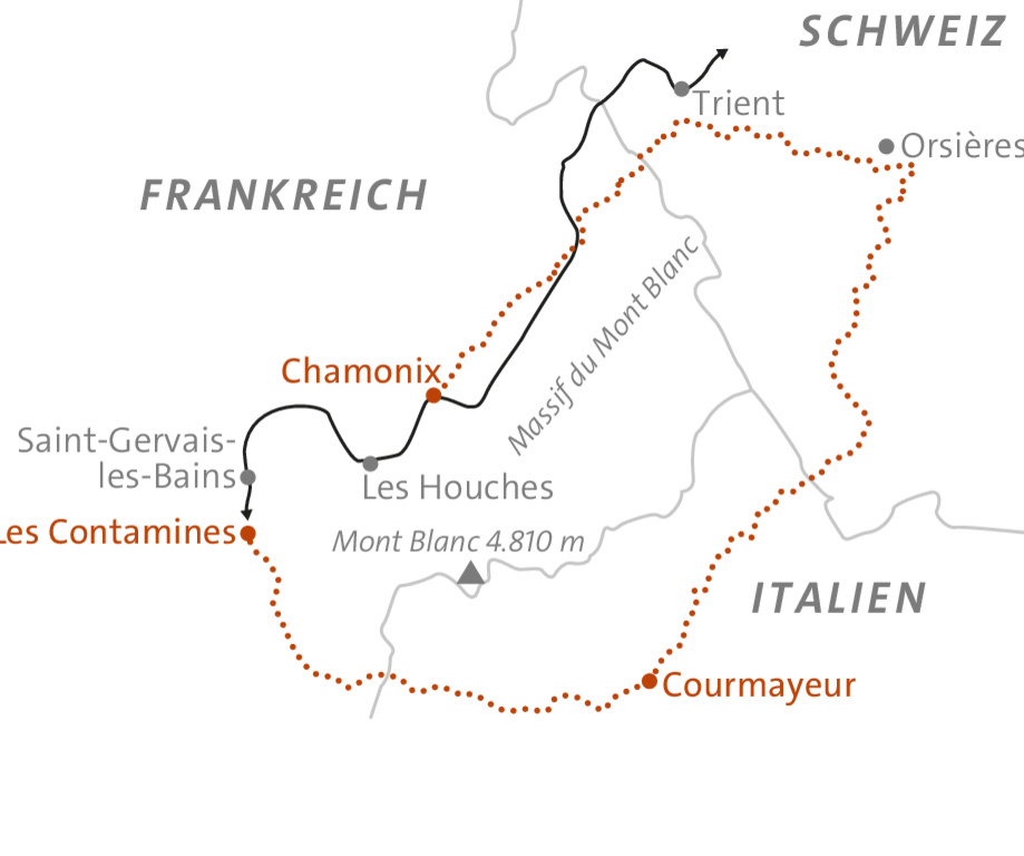 Der Mont Blanc ist nicht nur der höchste Berg Westeuropas sondern auch einer der schönsten Gebirge der Alpen. Und sein Ruf hält, was er verspricht: Auf dieser Tour von Frankreich in die Schweiz und nach Italien haben Sie Gelegenheit dieses fantastische Gebirge von all seinen Seiten und in jedem Licht zu bewundern, Sie wandern durch Täler und über Pässe und haben immer die herrlichsten Gletscher und Gipfel der Alpen vor Augen.
