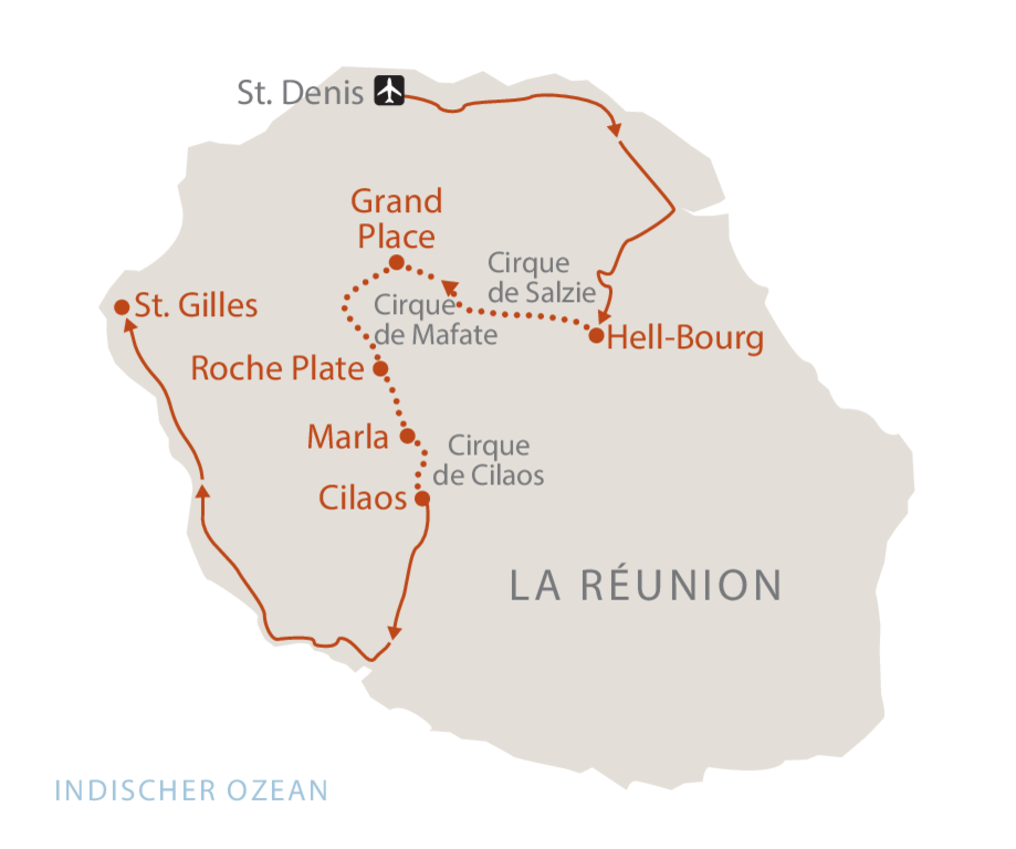 Die drei mächtigen Vulkankessel Cirque de Salazie, Cirque de Mafate und Cirque de Cilaos prägen die Insel mit steilen majestätischen Kraterwänden und bieten ein spannendes Netz ausgezeichneter Wanderwege. Hier wanderst Du durch eine atemberaubende Bergwelt von Hütte zu Hütte, vorbei an urigen Siedlungen und entlang des beeindruckenden Flusstals des Rivière des Galets. Am Strand von St. Gilles kannst Du Dich von den Anstrengungen Ihrer Trekkingtour entspannen.