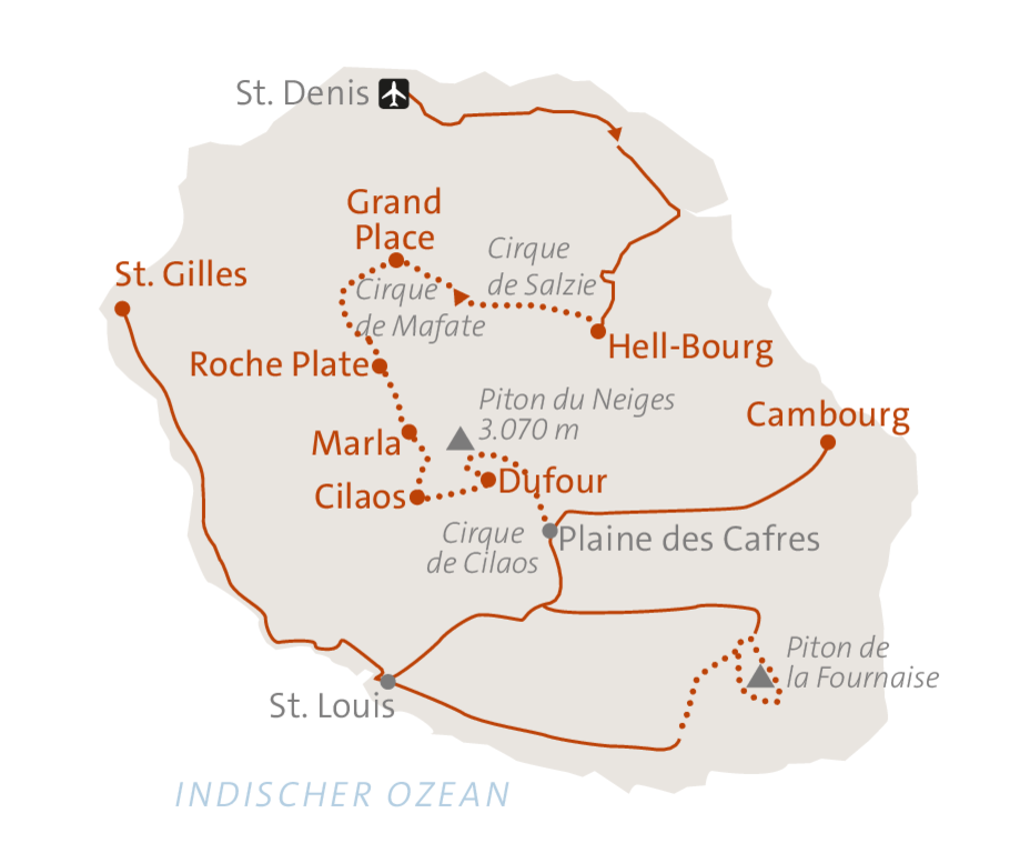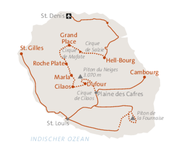 <Von Hell Bourg fährst Du nach Le Belier, Ausgangspunkt der ersten Wanderetappe in den Cirque du Mafate. Bald findest Du Dich in einer atemberaubenden, zerklüfteten Bergwelt wieder und kannst herrliche Blicke in den unter Dir liegenden Vulkankessel, auf kleine Siedlungen und steil aufragende Kraterwände und Gipfel genießen. Nach dem Abstieg in das Herz des Cirque du Mafate geht es wieder etwas bergauf, bis Du auf einer Anhöhe die Hütte von Grand Place erreichst. -