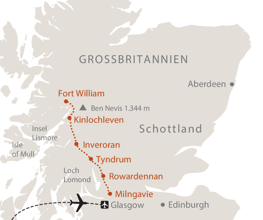 Schottlands ältester Fernwanderweg führt Sie hinein in die raue Welt der Highlands. Früher war dies karges Land, das nur von wenigen Händlern und Schafhirten bewohnt wurde. Schlachten wurden hier geschlagen und Räuber und Diebesbanden nutzten die Einsamkeit als Rückzugsgebiet. Heutzutage ist diese Region immer noch weitgehend unberührt und präsentiert sich äusserst abwechslungsreich. Die Wege schnörkeln sich einsam und verlassen am Ufer des Loch Lomond entlang, nur um wenige Kilometer weiter wieder Ausblicke auf die umliegenden Gipfel zu bieten. Der West Highland Way zählt heutzutage zu den beliebtesten Wanderrouten Europas und zieht Reisende aus aller Welt in seinen Bann.