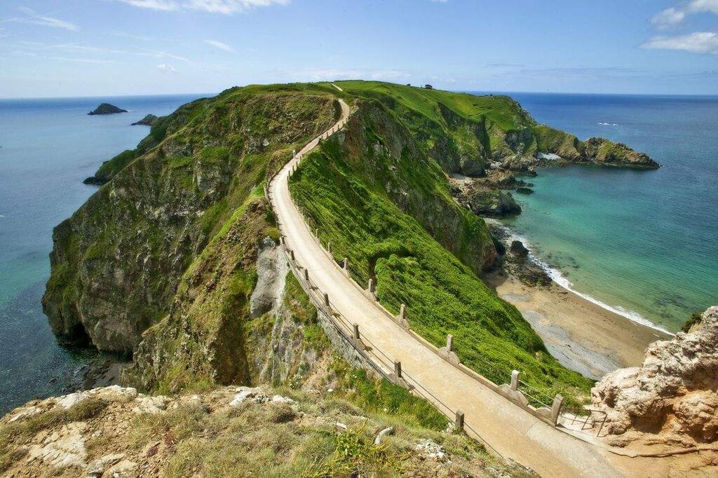 <Mit der Fähre geht es auf die Insel Sark. Diese ist mit ihren 64 Küstenkilometern die kleinste der vier Kanalinseln. Jedoch ist Sark durch ihre Geschichte und durch ihren mittelalterlichen Charme berühmt geworden. Auf der Insel gibt es keinen Straßenverkehr – mit Ausnahme von ein paar Traktoren – und gerade deshalb bietet sich dort eine Entdeckungsreise mit dem Fahrrad sehr gut an. Halten Sie bei den La Seigneurie Gardens und radeln Sie zur Halbinsel „Little Sark“ im Süden der Insel. Von der Landbrücke La Coupée haben Sie ein eindrucksvolles Panorama. -