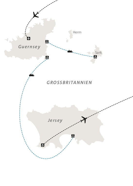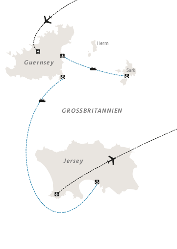 Klein, aber doch ganz groß! So präsentieren sich Jersey, Guernsey und Sark. Fahrradfahren ist auf den britischen Kanalinseln durch das milde Klima mit vielen Sonnenstunden besonders reizvoll. Jede Insel hat Ihren eigenen Charakter. Jersey ist geprägt von einer geschichtsträchtigen Vergangenheit, erste menschliche Reliquien werden bis in die Jungsteinzeit datiert und auch die jüngere Geschichte hat Spuren hinterlassen. Guernsey bietet neben verschlafenen Dörfern eine raue Natur und schöne Sandstrände. Autofrei empfängt Sie dagegen die zweitkleinste Kanalinsel Sark.
