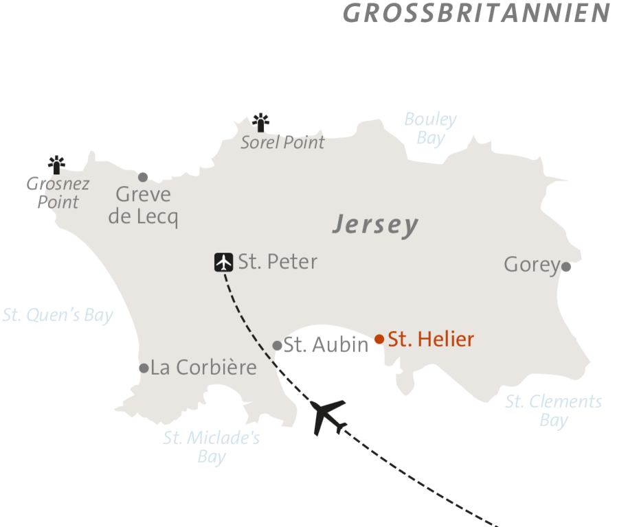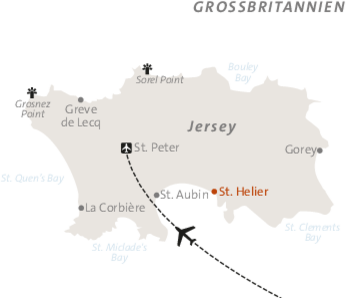<Individuelle Anreise nach Jersey. Sie werden am Flughafen der Insel oder am Hafen empfangen und danach zu Ihrer Unterkunft in St. Helier gebracht. -