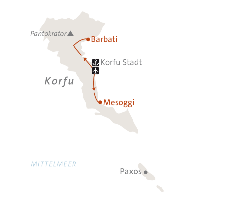<Mit dem öffentlichen Bus erreichen Sie in ca. 20 min. den kleinen Küstenort Benitses. Von hier aus steigen Sie durch einen schattigen Wald bergauf, wandern durch Olivenhaine bis nach Agioi Deka, wo Sie Ihre Wasserflasche an der Quelle auffüllen können. Nun geht es bergab und Sie durchwandern Pikantika und Achilleio, zwei malerische kleine Dörfer, bevor Sie Benitses erreichen, wo sich der Kreis schließt. Sie können in einem der Cafés am Dorfplatz ausruhen, bevor Sie mit dem Bus zurück nach Messonghi fahren. -