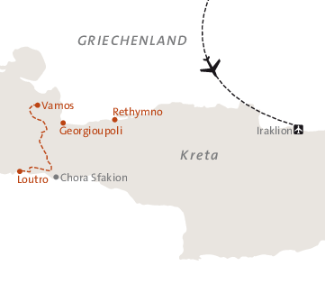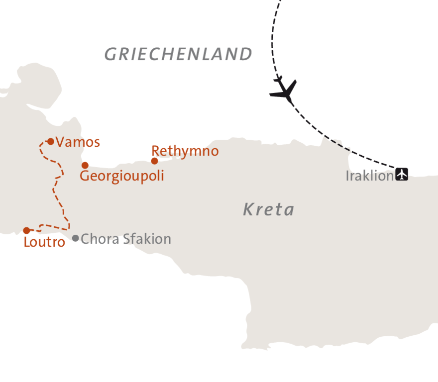 - Am Abreisetag fahren Sie von Loutro mit der Fähre in ca. 20 Minuten nach Chora Sfakion und von dort aus mit dem öffentlichen Bus nach Chania oder Heraklion. Falls Ihr Flug am Morgen geht, müssen Sie entweder eine zusätzliche Nacht in Chania oder Heraklion oder einen privaten Taxitransfer von Chora Sfakion zum Flughafen buchen, um rechtzeitig dort zu sein.