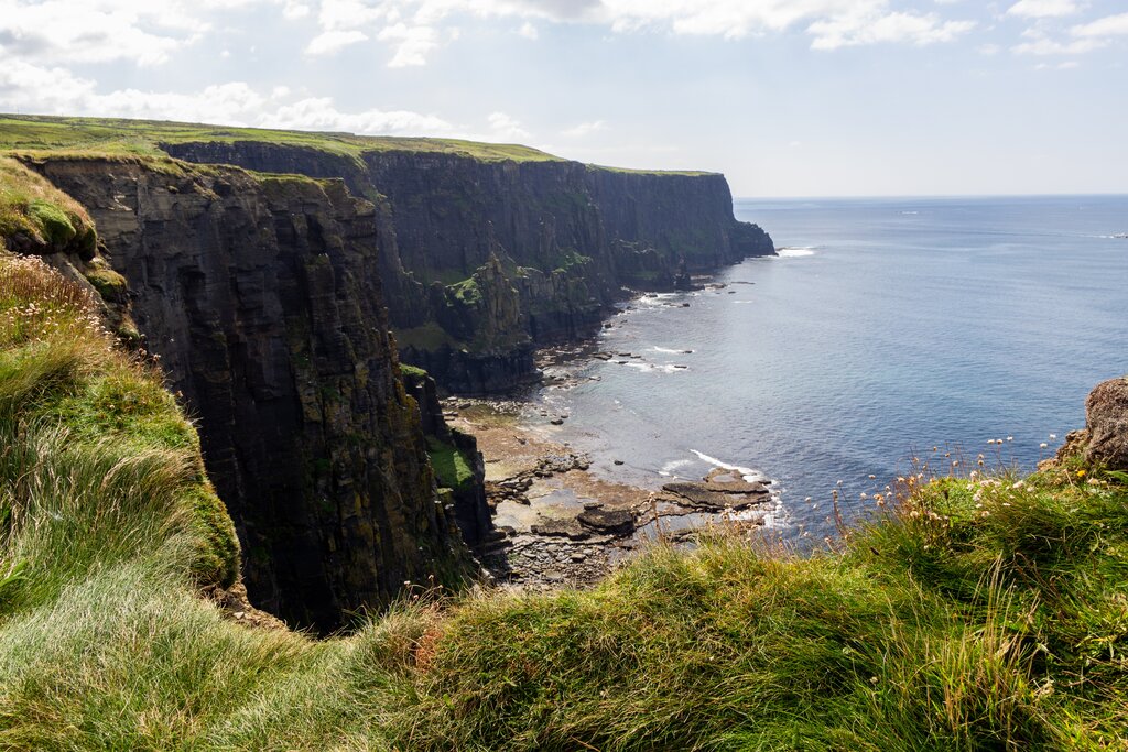 Von Liscannor aus führt der Weg über eine Landstraße mit Blick auf die Bucht von Liscannor, durch das Ackerland von Kilconnell bis zu einem Klippenpfad am Hags Head, wo das steile Gelände und die atemberaubenden Klippen zahlreiche Wildblumenarten und brütende Seevögel beherbergen. Der Wanderweg führt Sie zu den berühmten Cliffs of Moher, die sich vom Atlantik bis zu einer Höhe von 214 m erheben. Hier haben Sie die Möglichkeit, das fabelhafte neue Besucherzentrum zu erkunden, bevor Sie Ihre Reise in das Dorf Doolin fortsetzen, das weltweit als die Hauptstadt der traditionellen Musik Irlands bekannt ist.