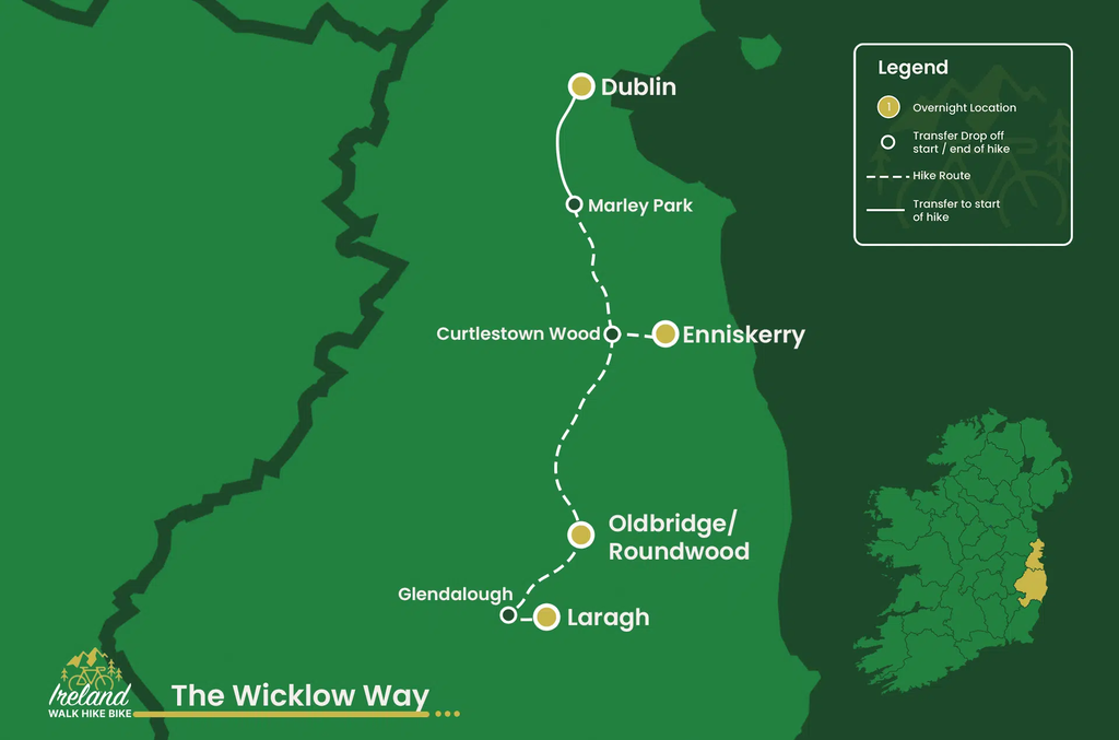 Diese fünftägige Reise entlang des Wicklow Way umfasst drei faszinierende Wanderungen und Übernachtungen in Dublin, Enniskerry, Oldbridge und Laragh. Sie beginnen mit dem pulsierenden Stadtleben Dublins, bevor Sie vom Marlay Park aus in die sanften Hänge der Wicklow Mountains aufbrechen. Ihre erste Wanderung endet in Enniskerry, einem malerischen Dorf, das für seine Nähe zum prächtigen Powerscourt Estate bekannt ist. Weiter geht es durch ruhige Wälder und hügelige Landschaften bis nach Oldbridge, wo Sie sich gut erholen können. Die letzte Etappe führt Sie tiefer in die wilde Schönheit der Grafschaft Wicklow – mit weiten Ausblicken und friedlichen Pfaden, die Sie nach Laragh bringen, dem Tor zur historischen Klosteranlage von Glendalough. Jeder Tag offenbart eine neue Facette von Irlands „Garten Grafschaft“ und garantiert eine unvergessliche Mischung aus Naturerlebnis und kulturellem Charme.