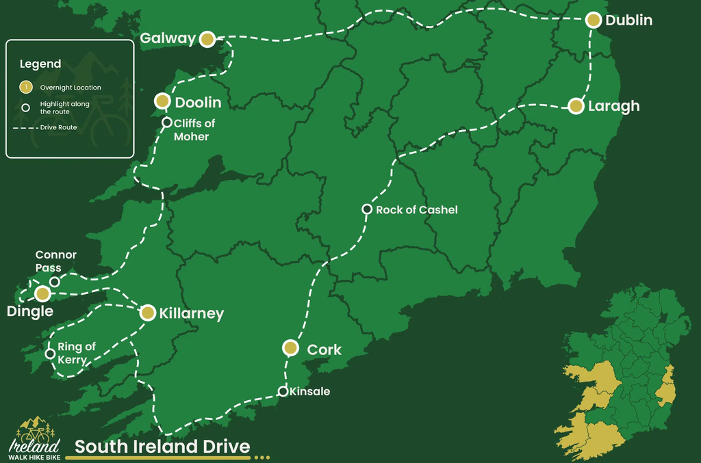 Erlebe das ultimative Südirland-Abenteuer auf unserer 10-tägigen Selbstfahrer-Wanderreise, bei der die Freiheit der offenen Straße auf die Faszination trifft, Irlands atemberaubendste Landschaften zu Fuß zu erkunden. Beginne deine Reise in einem lebendigen Zentrum Südirlands, wo du umfassende Routenpläne, Insider-Tipps und vorab organisierte Unterkünfte erhältst – alles darauf ausgelegt, deine Reise nahtlos und stressfrei zu gestalten. Diese innovative Tour ist perfekt für Reisende, die das Beste aus beiden Welten suchen – genieße die Flexibilität einer Selbstfahrerreise, während du versteckte Wanderwege entdeckst, die dich zu alten Ruinen, zerklüfteten Küstenklippen und abgelegenen Buchten führen. Im Laufe von 10 unvergesslichen Tagen fährst du auf kurvenreichen Landstraßen und malerischen Küstenrouten und hältst an, um eine Vielzahl unterschiedlicher Landschaften und kultureller Sehenswürdigkeiten zu erkunden. Wage dich abseits der bekannten Pfade und wandere entlang unberührter Strände, durch üppige Wälder und an jahrhundertealten Burgen vorbei, die die reiche Geschichte der Smaragdinsel erzählen. Jeder Tag bringt ein neues Abenteuer – ob du nun atemberaubende Klippenpanoramen einfängst, durch charmante Dörfer voller Tradition schlenderst oder authentische irische Küche in gemütlichen Pubs genießt – jeder Moment ist darauf ausgelegt, dich in das lebendige Erbe und die natürliche Pracht Südirlands eintauchen zu lassen. Ideal für Familien, Paare und Alleinreisende verbindet unsere 10-tägige Selbstfahrer-Wanderreise durch Südirland die Unabhängigkeit einer Autoreise mit der intensiven Nähe zum Land beim Wandern. Nutze die Möglichkeit, deine Reiseroute individuell nach deinen Interessen zu gestalten – ganz gleich, ob du gemütliche Fahrten durch die sanften Hügel bevorzugst oder dich auf spannende Wanderungen einlässt. Buche deine Reise noch heute mit Ireland Walk Hike Bike und begib dich auf eine unvergessliche Reise, die die zeitlose Faszination, reiche Kultur und unvergleichliche Schönheit Südirlands feiert.