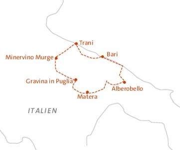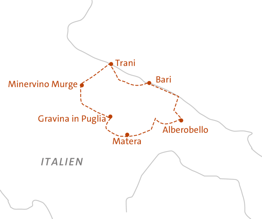 In Apulien treffen Kunst, Geschichte und Natur sowie die italienische Gastfreundschaft aufeinander. Mit Start in Bari erkunden Sie die karstigen Hochebenen sowie die Küstenregion. Auf Ihrer Route befinden sich 3 UNESCO-Weltkulturerbestätten: Castel del Monte, die geheimnisvolle Festung des Kaisers Friedrich II. von Hohenstaufen, die Sassi von Matera, Europas Kulturhauptstadt 2019 und die Trulli von Alberobello, typische und einzigartige Trockensteinhäuser.