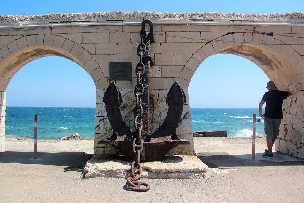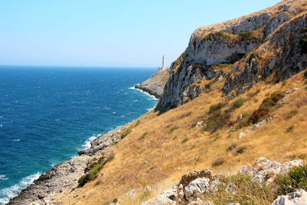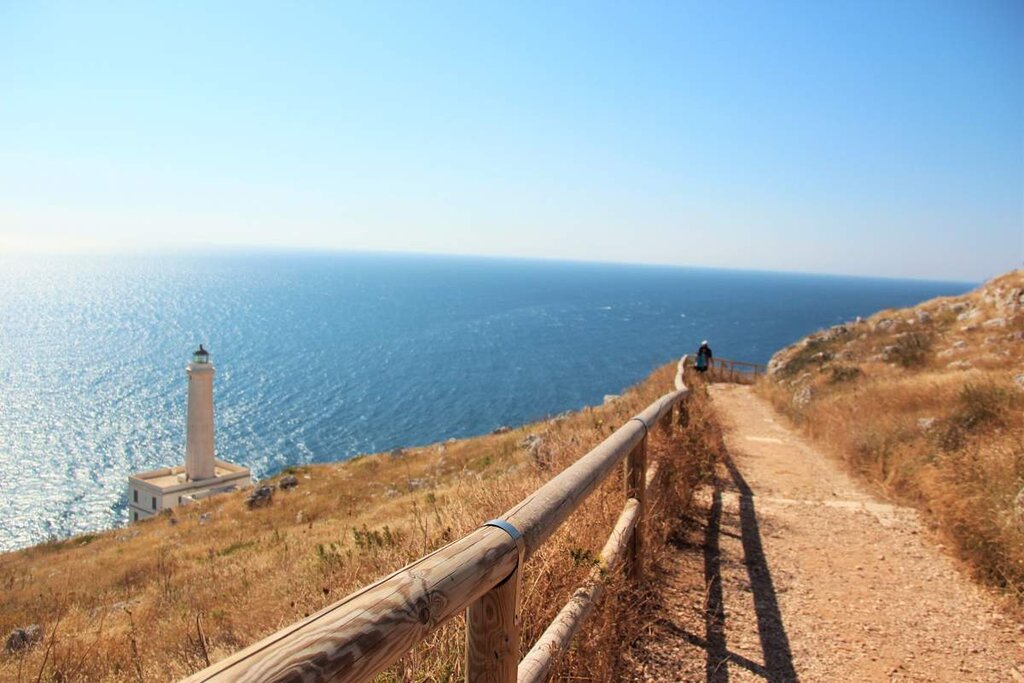 <Durch das Labyrinth der engen Gassen der Altstadt erreichen Sie den neuen Hafen. Hier führt ein flacher Schotterweg an einigen Buchten entlang. Sie kommen an mehreren Bunkern aus dem zweiten Weltkrieg vorbei. Sie können einen kurzen Umweg zu einem interessanten “Bauxitsee” nehmen, indem Sie leicht landeinwärts gehen. An der Küste finden Sie zahlreiche Möglichkeiten, in kristallklarem Waser zu baden. Dann geht es weiter die Küste entlang zum Leuchtturm Punta Palascia, der schon von Weitem gut sichtbar ist. An einigen Stellen wir die kniehohe Mittelmeervegetation sehr dicht und Sie müssen sich Ihren Weg bahnen. Aber solange Sie den Leutturm vor sich und das Meer zu Ihrer Linken haben, sind Sie auf dem richtigen Weg! Bei klarem Wetter können Sie die albanischen Berge am anderen Ufer der Adria sehen. Der Leuchtturm Punta Palascìa ist der östlichste Punkt Italiens und liegt nur 71km von Albanien entfernt.