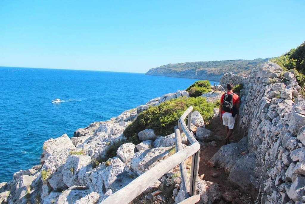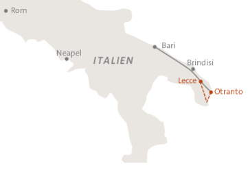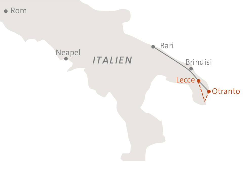 Der Küstenwanderweg Apuliens von Otranto nach Gagliano del Capo ist die perfekte Verbindung aller Herrlichkeiten, die Apulien zu bieten hat: sagenhafte Aussichten, tolle Plätze zum Schwimmen, unbekannte Dörfer, die nur darauf warten, entdeckt zu werden sowie windgepeitschte, unberührte Natur. Nach einer bezaubernden Rundwanderung inmitten von Oliven- und Orangenbäumen verlassen Sie Otranto und folgen einem rötlichen Pfad, der wenige Meter vom Meer entfernt verläuft und zum Leuchtturm von Punta Palascia, dem östlichsten Punkt Italiens, und dann weiter zur winzigen Bucht von Porto Badisco führt. An den folgenden Tagen kommen Sie an winzigen Fischerdörfern, Küstenkurorten und antiken messapischen Dörfern vorbei. Die Reise endet in Lecce mit seinen barocken Palästen und romanischen Meisterwerken. Die Route wie auch die sie umgebende Landschaft ändern sich fortlaufend: vom Hirtenweg an der Küste, entlang einer niedrigen zerklüfteten Klippe bis zu den weiten Wiesen der apulischen “Savana”, über von antiken Karren gezeichneten Straßen und durch üppige Wälder mit hohen Bäumen. Jede Wanderung ist auch ein wahres Fest für die Sinne: mit jedem Schritt kommen Sie der Natur näher. Sie begleitet Sie mit dem Rascheln uralter Olivenbäume, dem Zirpen der Grillen, dem Duft von wildem Fenchel und Lakritz und dem azurblauen Glitzern des Meeres.