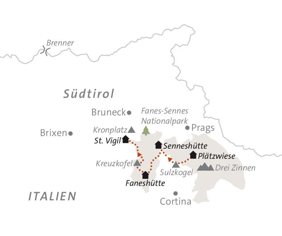Genießen Sie Hochgebirgswanderungen durch ein wundervolles Naturschutzgebiet mit den atemberaubenden Landschaften der imposanten Kalksteinberge und schneebedeckten Gipfel, Postkartenalmen und idyllischen Bergwiesen. Dieser einzigartige, deutschsprachige Teil Italiens glänzt mit hervorragender Küche, einer artenreichen Tier- und Pflanzenwelt, in welcher Sie auch Murmeltiere und Gämse antreffen können. Im Frühling und Sommer blühen die Almwiesen in den schönsten Farben. Von Plätzwiese aus wandern Sie durch das Fanes-Sennes Naturschutzgebiet nach St. Vigilio di Marebbe und übernachten in wunderschön gelegenen Schutzhütten, wo Sie sich mit herzhaften Mahlzeiten für die atemberaubenden Wanderungen stärken können. Die Wanderungen verlaufen auf gut ausgeschilderten Wegen und sind anspruchsvoll lang, aber nicht erschöpfend.