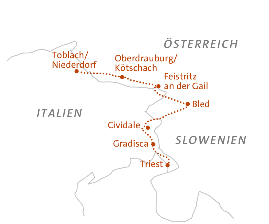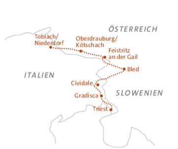 Ausgehend von den nordöstlichen Dolomiten führt der erste Teil der Strecke entlang des Flusses Drau durch das gleichnamige Tal und dann weiter durch das Gailtal auf gemütlichen Radwegen durch Österreich. Nach einem kurzen Abstecher in die italienische Grenzstadt Tarvis radeln Sie weiter nach Slowenien. Am märchenhaften Bleder See verweilen Sie zu Füßen der Julischen Alpen. Nach einem Transfer auf die Südseite der Alpen kehren Sie zurück nach Italien in die Region Friaul-Julisch Venetien und in die bekannte Weingegend des Collio. Die ehemalige Hauptstadt der Langobarden, Cividale del Friuli, ist einen ausgedehnten Bummel wert. Anschließend erwartet Sie ein spektakulärer Abschluss der Radreise an der Adria. Am letzten Tag radeln Sie am Meer entlang in die ehemalige Habsburger Hafenstadt Triest.