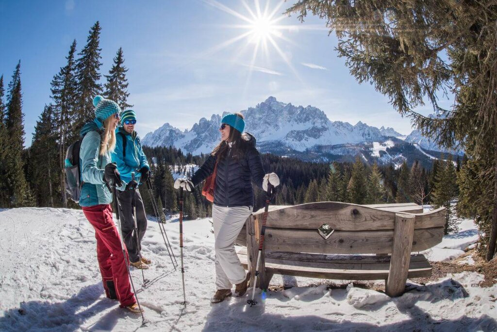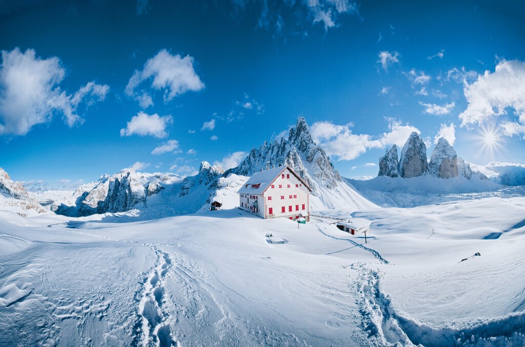<Von Niederdorf/Toblach bringt Sie ein Transfer in das Innerfeldtal nach Sexten. Anfangs wandern Sie über die winterlichen Lärchenwiesen bis zur Dreischusterhütte zu Füßen der mächtigen Dolomitengipfel. Kosten Sie die