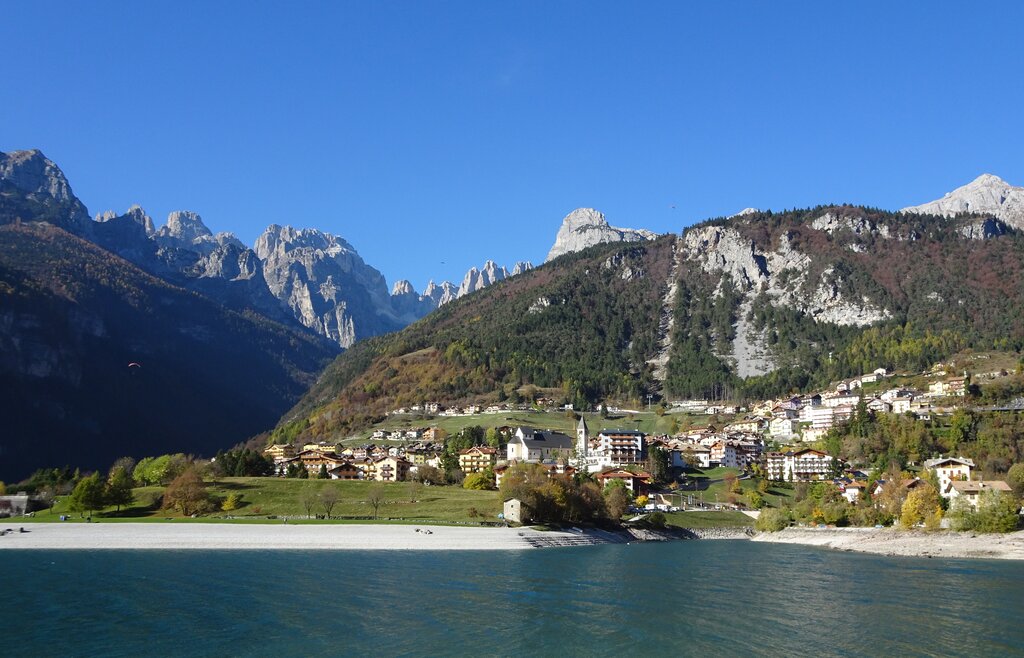 <Bei einem kurzen Transfer können Sie die eindrucksvolle Landschaft des Nonstal bewundern. Anschließend wandern Sie auf dem Jakobsweg in die luftige Hochebene der Paganella. Durch ausgeprägte Waldgebiete führt Sie Ihr Weg hinauf nach Cavedago mit seiner berühmten dreibögigen Brücke. Über das Feuchtgebiet eines Karst-Sees bis Andalo und weiter nach Molveno, zu Füßen der Brenta-Dolomiten und am gleichnamigen türkisblau glitzernden Alpensee gelegen. -