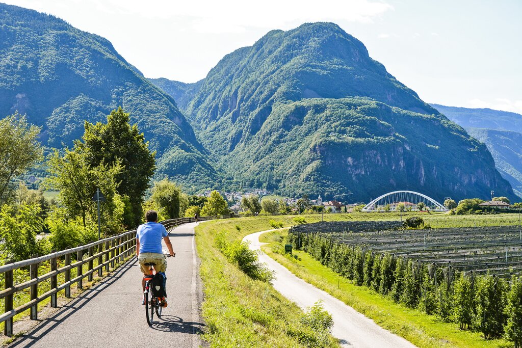 <Heute fahren Sie auf dem Radweg am Ufer der Etsch entlang, vorbei an den berühmten Obstgärten und Weinbergen des Unterlandes. Sie können sich für die hügeligere Variante entscheiden, die Sie zum schönen Kalterer See führt, oder Sie können den gesamten Radweg entlang der Etsch fahren, der völlig flach ist (gesamte Strecke: 65 km, Höhenunterschied +295 m/-365 m). Auf halbem Weg zwischen Bozen und Trient treffen Sie auf Salurn, der Sprachgrenze zwischen dem deutschsprachigen und dem italienischsprachigen Gebiet Norditaliens. Man kann mit dem Zug in mehreren Bahnhöfen die Etappe verkürzen.