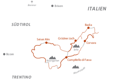PKW: Von Norden kommend auf der Brennerautobahn (A13, mautpflichtig) über Innsbruck und den Brennerpass (Autobahnausfahrt Klausen-Gröden) nach Seis Parkplatz für die erste Nacht kostenlos, anschließend Parkmöglichkeiten an der Talstation Seiser Alm Bahn, kostenlos beim großen offenen Parkplatz, oder ca. € 30,00 für 7 Tage in der Parkgarage.