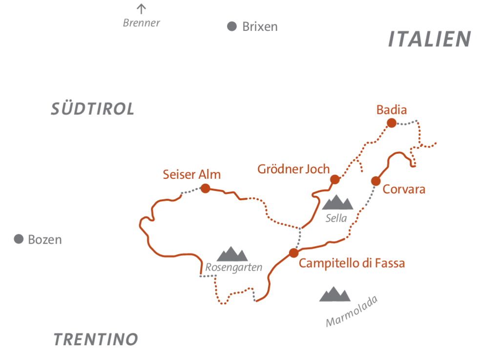 Länge: ca. 10 kmAnspruchsvolle Variante: Bequem gelangst du mit dem Almbus nach Saltria. Von hier hast du einen ersten schönen Blick auf den Plattkofel/Sasso Piatto (2.950 m). Zuerst folgst du der Markierung bis zum Fassa Joch und der Plattkofelhütte (2.305 m). Kurz nach der Hütte führt dich der Weg zuerst über einen erdigen Wanderweg, später über einen schottrigen und teils mit Fels durchsetzten Weg hinauf zum Gipfel. Bis dahin eröffnen sich dir immer wieder grandiose Aussichten und Fotomotive nach allen Seiten. Insbesondere der Blick in Richtung Südosten zur Marmolata/Marmolada (3.343 m), den höchsten und einzigen mit Gletschereis bedeckten Gipfel der Dolomiten, dominiert die Szenerie. Der Abstieg erfolgt über den Aufstiegsweg bis zur Plattkofelhütte und entlang des Friedrich August Weges wanderst du zur Seilbahn Pradel-Salei, von wo aus du mit der Seilbahn Salei Rodella zum Wanderweg "Lupo Bianco" gelangst. Dieser führt bergab, vorbei an Wasserfällen (ca. 45 Min.) nach Canazei. Von hier per Bus via Campitello di Fassa nach Soraga di Fassa ins Hotel.