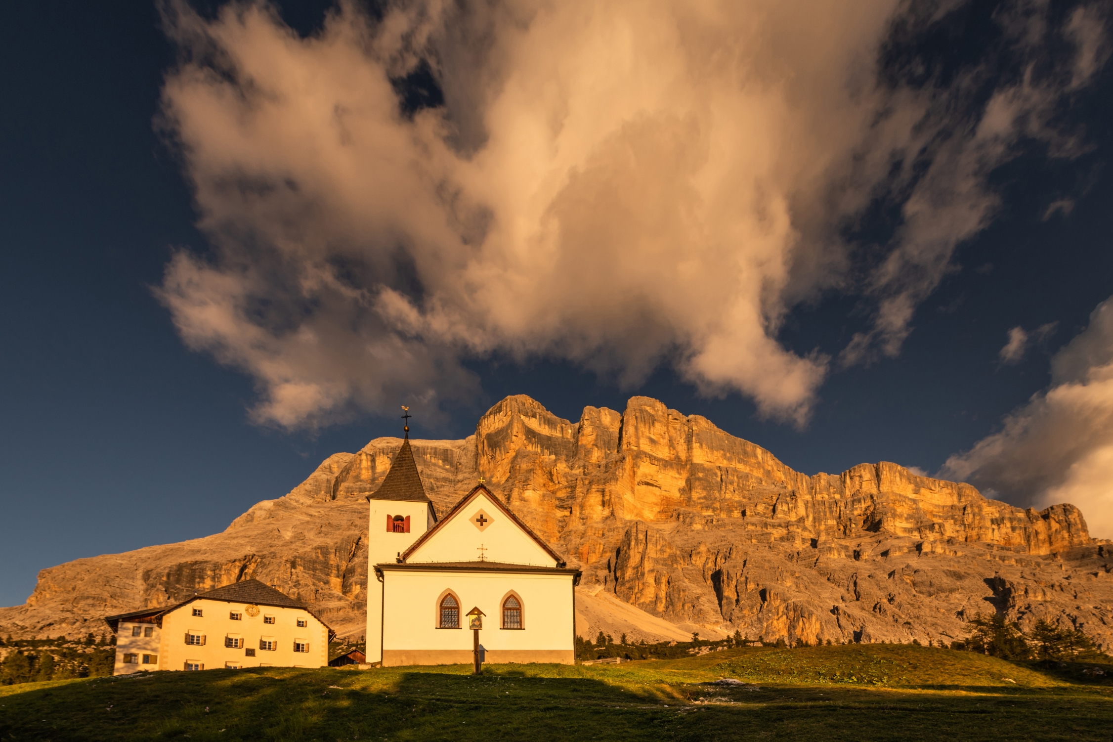 <Leichte Variante: Heute wanderst du unter der imposanten Westwand des Heiligkreuzkofels im Naturparks Fanes-Sennes-Prags. Auffahrt mit der Seilbahn nach La Crusc auf 2.047m. Dort steht eine Kapelle aus dem Jahr 1484, danebenliegend kam 1718 das Heilig Kreuz-Hospitz dazu, heute ist das denkmalgeschützte Gebäude eine Schutzhütte. Durch Wiesen, Weiden und Wälder wanderst du nach St. Kassian, das Dorf liegt idyllisch unter den imposanten Felswänden der Cunturinesspitze, des Piz Lavarela und des Lagazuoi. Von hier aus geht es mit dem öffentlichen Bus wieder nach Corvara.