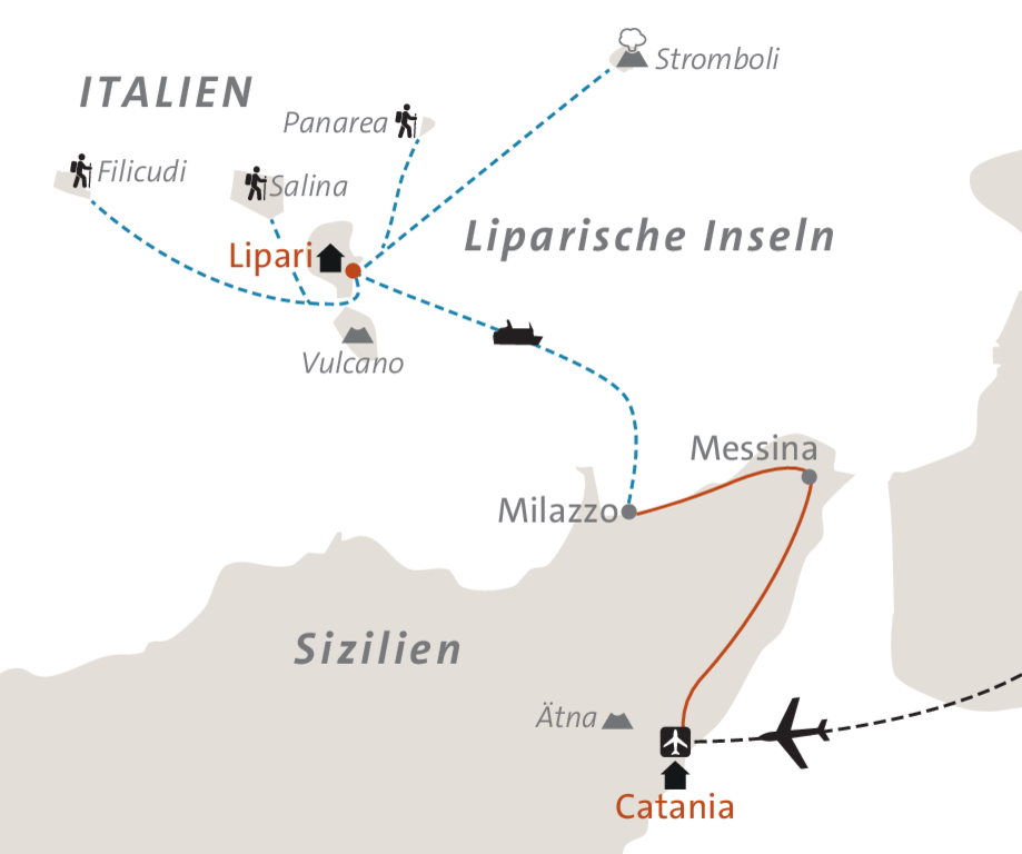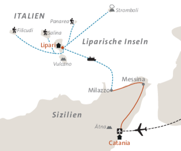 Wenn du die Flüge selbst buchst, achte bitte auf die Ankunftszeit: Bei Landungen nach 15.30 Uhr kannst du die letzte Fähre nach Lipari nicht mehr erreichen. In diesem Fall verbringst du die erste Nacht in Milazzo und setzt am nächsten Morgen mit der Fähre nach Lipari über.