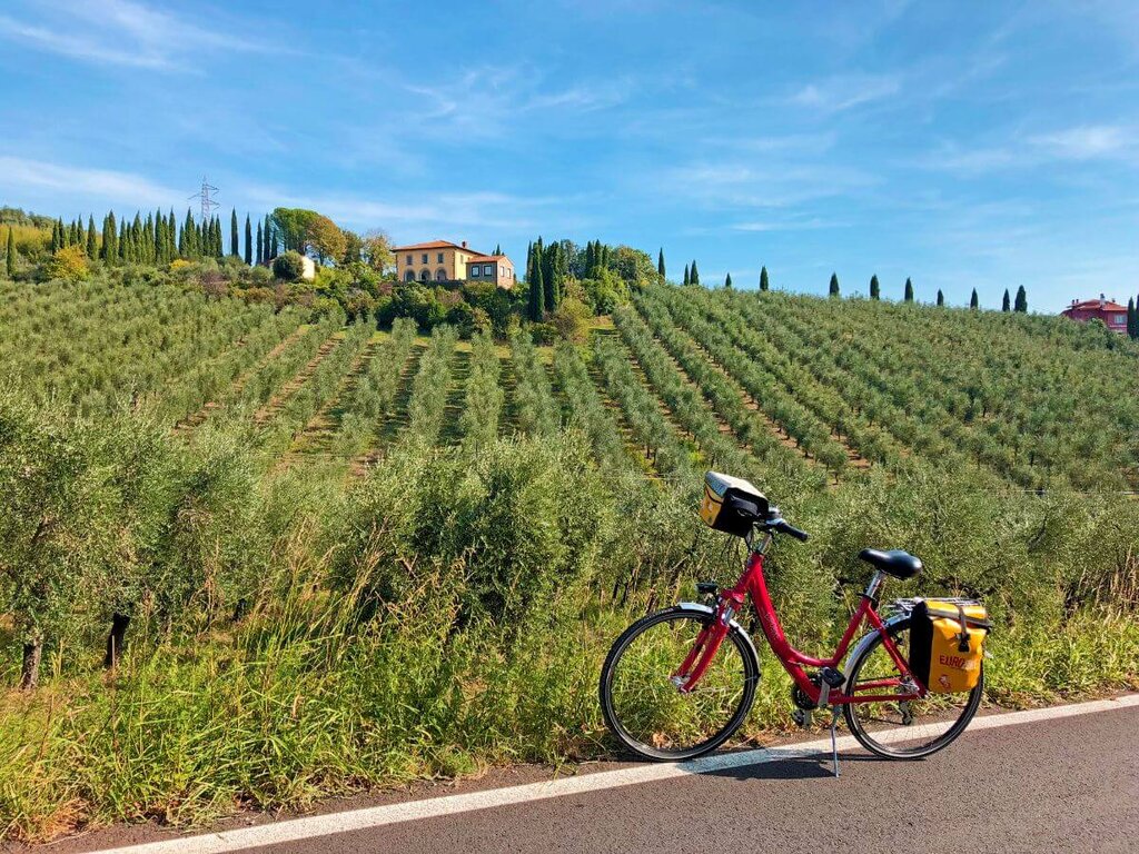 <Zunächst führt der Radweg entlang des Arno, wo fruchtbare Felder die Fahrt begleiten. Weiter geht’s durch die pisanischen Hügel, an deren sanften Hängen lieblicher Wein, saftige Oliven und süße Pfirsiche gedeihen. Kleine, mittelalterliche Dörfer kleben wie Schwalbennester an den Hügelkuppen. Mit diesen Eindrücken ist das heutige Etappenziel, der Kurort Casciana Terme, bald erreicht.