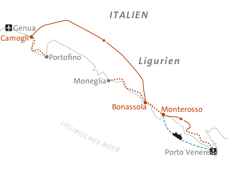 Aussichten auf die üppigen mediterranen Weinberge, Wildblumen und Olivenhaine genießen; im Landesinnern warten indessen dichte Pinien- und Kastanienwälder darauf entdeckt zu werden. Die Reise beginnt mit einer Wanderung zur einzigartigen Abtei von San Fruttuoso und dem Jetset Küstendorf Portofino. Danach reisen Sie mit dem Zug zu den malerischen Dörfern Bonassola und Monterosso und begeben sich somit in das magische Land der Cinque Terre, fünf einmalige Fischerdörfer, die wie Edelsteine entlang der steil abfallenden Küste aufgereiht wurden. Diese erstreckt sich den ganzen Weg bis zur bunten Stadt Porto Venere, wo Sie die köstliche einheimischen Küche probieren und sich mit einem Glas Weißwein auf der Terrasse eines Cafés am Meer entspannen können.