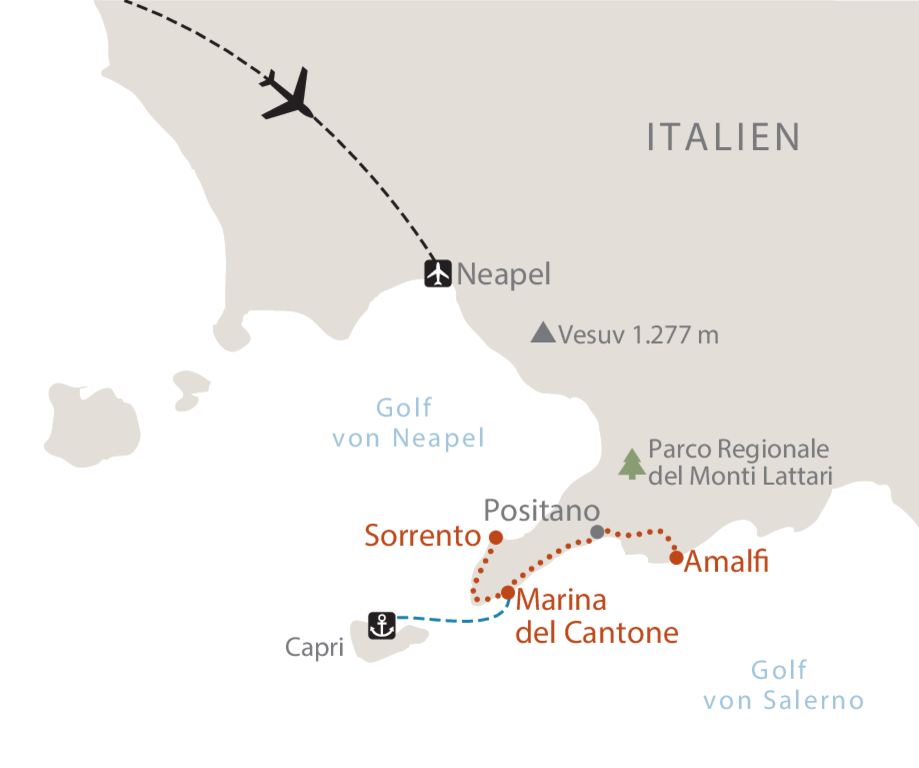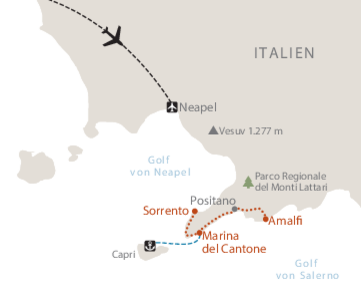 Sorrent und die Amalfiküste können zu bestimmten Jahreszeiten stark überlaufen sein. Daher arbeiten wir mit mehreren Hotels mit ähnlichem Standard. Aus diesem Grund beginnen und enden alle Wanderungen an zentralen Punkten der Dörfer, die sie von Ihrem Hotel aus erreichen müssen. Das bedeutet, dass die Start- und Endpunkte der Routen leicht abweichen können. Vergewissern Sie sich daher, ob Ihre Unterkunft die gleiche ist, die in diesem Programm genannt ist. Falls dies nicht der Fall ist, achten Sie bitte besonders auf die Anfangs- und Endpunkte der Routen. Wir waren bei der Wahl der alternativen Unterkünfte darum bemüht, Standard und Qualität zu wahren.
