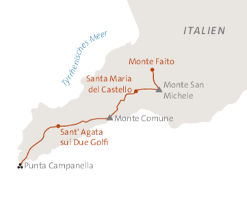 <Von der Ebene des Monte Faito wandern Sie heute auf dem Höhenweg hinauf zum höchsten Berg der Gegend, dem Monte San Michele. Sie wandern zunächst entspannt durch die Buchenwälder und beginnen dann Ihren Aufstieg zum Gipfel des Monte San Michele. Ein Abschnitt der Wanderung verläuft auf dem oberen Teil des berühmten”Sentiero degli Dei” mit einem herrlichen Panorama auf Positano und die Sorrentiner Halbinsel! Ein atemberaubend schöner und leichter Wegteil führt Sie dann zu Ihrem Agriturismo in Santa Maria al Castello, , der alten Festung zur Verteidigung des schmalen Tals zwischen der Amalfi-Seite und der Sorrent-Seite der Halbinsel. Von hier aus können Sie den Golf von Salerno und den Golf von Neapel gleichermassen bewundern. Wir empfehlen Ihnen abschliessend noch einen kurzen Spaziergang zu einem der eindrucksvollsten Panoramapunkte der Gegend: Hier liegt Positano buchstäblich zu Ihren Füßen! Das regionaltypische Abendessen nehmen Sie dann in Ihrem Agriturismo ein.