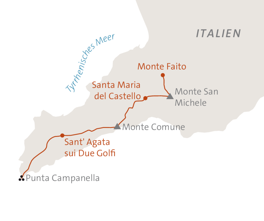 <Rundwanderung über den Bergkamm, der den Golf von Neapel und den Golf von Salerno trennt. Durch Olivenhaine und Obstgärten gehen Sie hinunter zur malerischen Bucht Marina di Crapolla. Dann geht es auf gut ausgebauten Wegen weiter ins entzückende Küstendorf Marina del Cantone auf der Südseite der Sorrentiner Halbinsel. Die Landschaft ist spektakulär: Sie laufen durch wunderschöne Landstriche aus Olivenhainen und Trockensteinmauern und haben dabei das Meer immer im Blick. Auf halbem Weg erreichen Sie morgens die wunderschöne, kleine Bucht von Recommone, ein perfekter Ort für ein Bad im Meer! Über die felsige Landzunge, vorbei an den Ruinen eines mittelalterlichen Wachturms wandern Sie dann in das kleine Küstendorf Marina del Cantone. Von hier aus folgen Sie den mittelalterlichen Stufen hinauf zum kleinen Ort Nerano und von dort hoch zur Kirche von San Costanzo, von wo aus sich Ihnen ein 360-Grad-Panorama über den Golf von Neapel und die Amalfiküste eröffnet. Ein spektakulärer Wanderpfad entlang der beeindruckenden Klippen der Landzunge führt Sie zum äussersten Ende der Halbinsel (Punta Campanella), wo der Legende nach Odysseus einen Tempel zu Ehren Athenas errichtete. Der Pfad bietet stellenweise kleinere Herausforderungen, ist insgesamt jedoch gut zu bewältigen. Der Rückweg von Punta Campanella bis ins kleine Örtchen Termini erfolgt auf der alten, römischen Straße “Via Minerva” mit herrlichem Blick auf Capri und mehrere, mittelalterliche Wachtürme, die einst zur Verteidigung der Küste dienten. In Termini nehmen Sie den öffentlichen Bus zurück nach Sant’ Agata sui Due Golfi, wo Sie in Ihrem Agriturismo zum Abendessen erwartet werden.