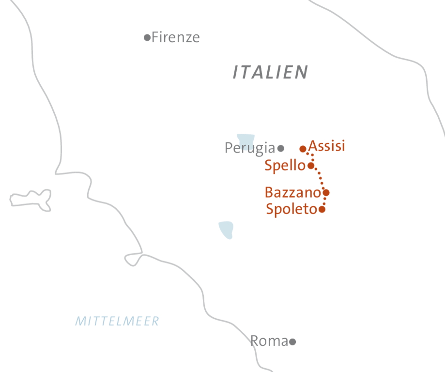 Umbrien wird oft als das „grüne Herz Italiens“ bezeichnet, und zu recht, denn es ist eine der reichsten Regionen des Landes, in allen Aspekten: Kultur, Essen, atemberaubende Landschaften, üppige Wälder. Der historische Weg von Assisi nach Spoleto führt Sie auf den Spuren des Hl. Franziskus von Assisi, der Mann der vor 800 Jahren beschloss, die Armut zu umarmen. Er lebte in engem Kontakt mit den Tieren und führte ein Wanderleben und versuchte Freude ins Leben anderer Menschen zu bringen. Sie werden seine Anwesenheit spüren, während Sie durch die großartige Landschaft wandern. Sie laufen durch Wälder, Felder, Weingüter und Olivenhaine. Und immer ein mittelalterliches Dorf auf einem Hügel in Sicht: Die Dörfer, die Sie auf Ihrem Weg besichtigen, haben Ihre eigene Identität beibehalten und es kommt so vor, als ob die Zeit still stehen würde. Dieser Teil Italiens ist weltweit für seine unendliche kulinarische Vielfalt berühmt, mit der Sie Ihren Gaumen verwöhnen können.