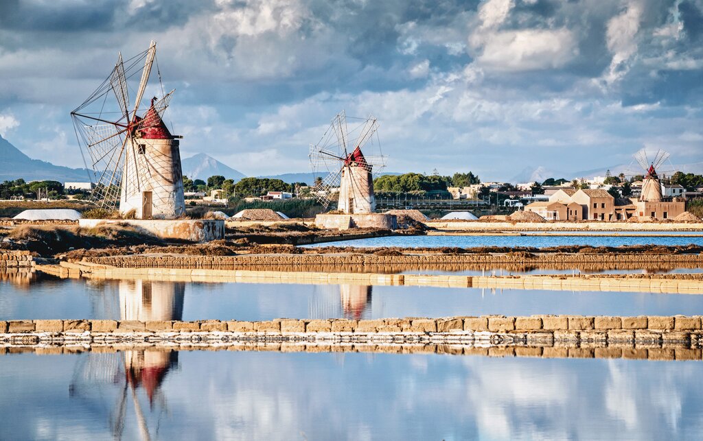 <Man tritt ganz entspannt in die Pedale! Die Panoramastraße führt am Meer vorbei, wo der Blick auf die Windmühlen der Salinen überrascht. Man kann die Insel Mozia besuchen, eine antike punische Festung, heute eine archäologische Besichtigungsstätte und Sitz eines privaten Museum von hohem Wert. Jetzt sind es nur noch wenige Kilometer bis nach Marsala, wo Sie eine der Kellereien, wo man einen besonderen Likör herstellt, “il Marsala all’uovo” (Marsala mit Ei), in der ganzen Welt berühmt, besuchen sollten. -
