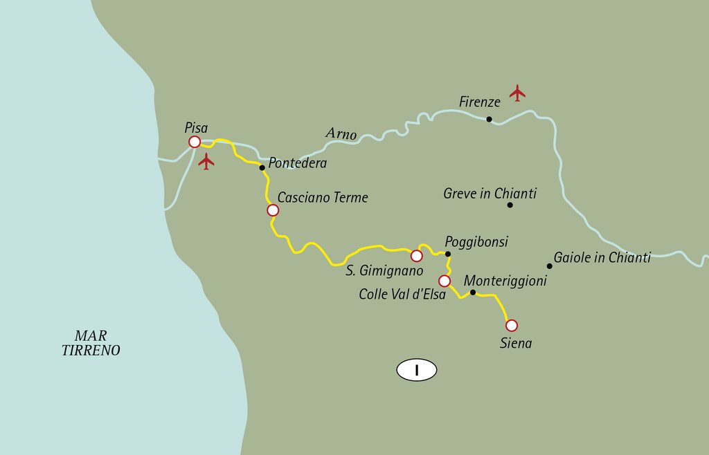 Wenn Sie weniger als eine Woche Zeit haben, ist die Strecke zwischen Pisa und Siena ideal, um einen kleinen Eindruck der zauberhaften Region Toskana zu erhalten. Während Sie durch Weinberge und Olivenhaine radeln, haben Sie die Möglichkeit, mittelalterliche Dörfer wie Casciana Terme, San Gimignano und Monteriggioni zu entdecken. Vergessen Sie nicht die kulinarische Stopps in den unzähligen typischen Restaurants entlang des Weges!