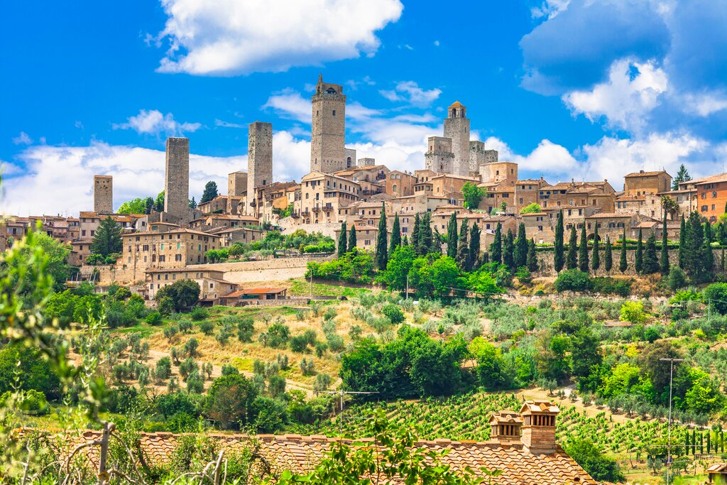 <Die Via Francigena (Frankenstraße) geleitet Sie durch Weinberge und sanfte Hügel bis nach San Gimignano, eine auf dem Hügel gelegene mittelalterliche Ortschaft. Dieses von der UNESCO ausgezeichnete, von Mauern umgebene Dorf ist bekannt für seine vielen Türme. Lassen Sie sich am Abend von der lokalen Küche verwöhnen! Alternative Übernachtung ist in Colle Val d’Elsa (70 km, Höhenunterschied +1000m/-980m).