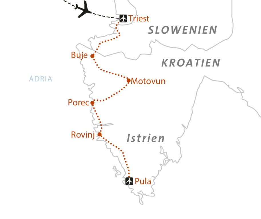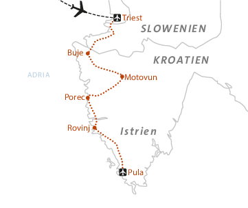 Auf dieser fantastischen Reise von Triest nach Pula werden Sie Zeuge der kulturellen Vielfalt und dem Reichtum der Halbinsel Istrien. Triest und Pula waren Hafenstädte des österreichisch-ungarischen Kaiserreichs, Poreč und Rovinj waren wichtige Handelszentren im Römischen Reich und Motovun, Grožnjan waren typische mittelalterliche befestigte Bergstädte. Weinberge und Olivenhaine werden Weinberge und Olivenhaine werden Sie während der Radtour in der Region begleiten, in der Trüffel und viele andere Spezialitäten, die Sie am Ende des Tages genießen können.