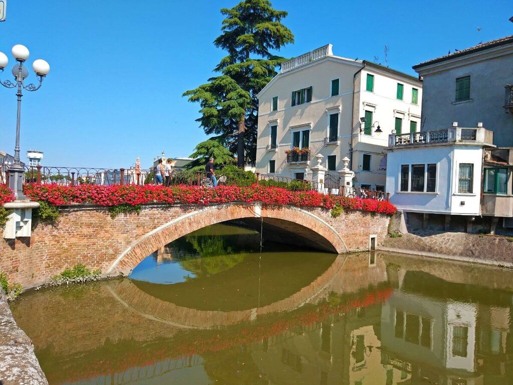 <Ein kurzes Stück führt die Strecke zunächst entlang dem längsten Fluss Italiens, dem Po. Danach geleitet sein Seitenarm – der Po di Goro – mitten durch sein Mündungsdelta Richtung Meer. Vielleicht noch eine Abkühlung in der Adria bevor das bezaubernde Comacchio erreicht ist? Prächtige Palazzi, reich geschmückte Kirchen und zahlreiche Brücken zeugen noch vom einst durch die Salzgewinnung erlangten Wohlstand. -