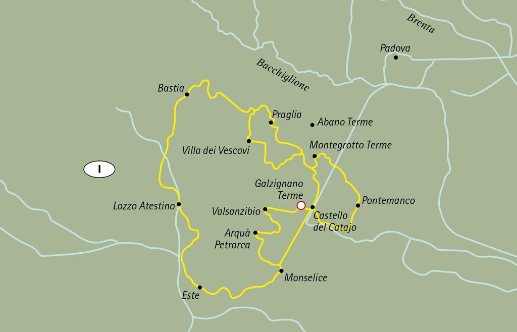 <Heute haben Sie die Wahl. Genießen Sie eine angenehmen Fahrt auf dem Radweg der Euganeischen Hügel, der die gesamte Kette der vulkanischen Hügel umfasst und zwischen Wäldern, Abteien und kleinen Städten wie Este und Bastia verläuft. Da die Etappe recht lang ist, können Sie den Tag aber auch in Ihrem Kurort verbringen und eine der zahlreichen Thermalbehandlungen genießen. Immerhin befinden Sie sich im größten Thermalpark Europas! Eine andere Idee wäre, den Tag in Padua oder Venedig zu verbringen, aber nehmen Sie bitte nicht das Fahrrad mit!