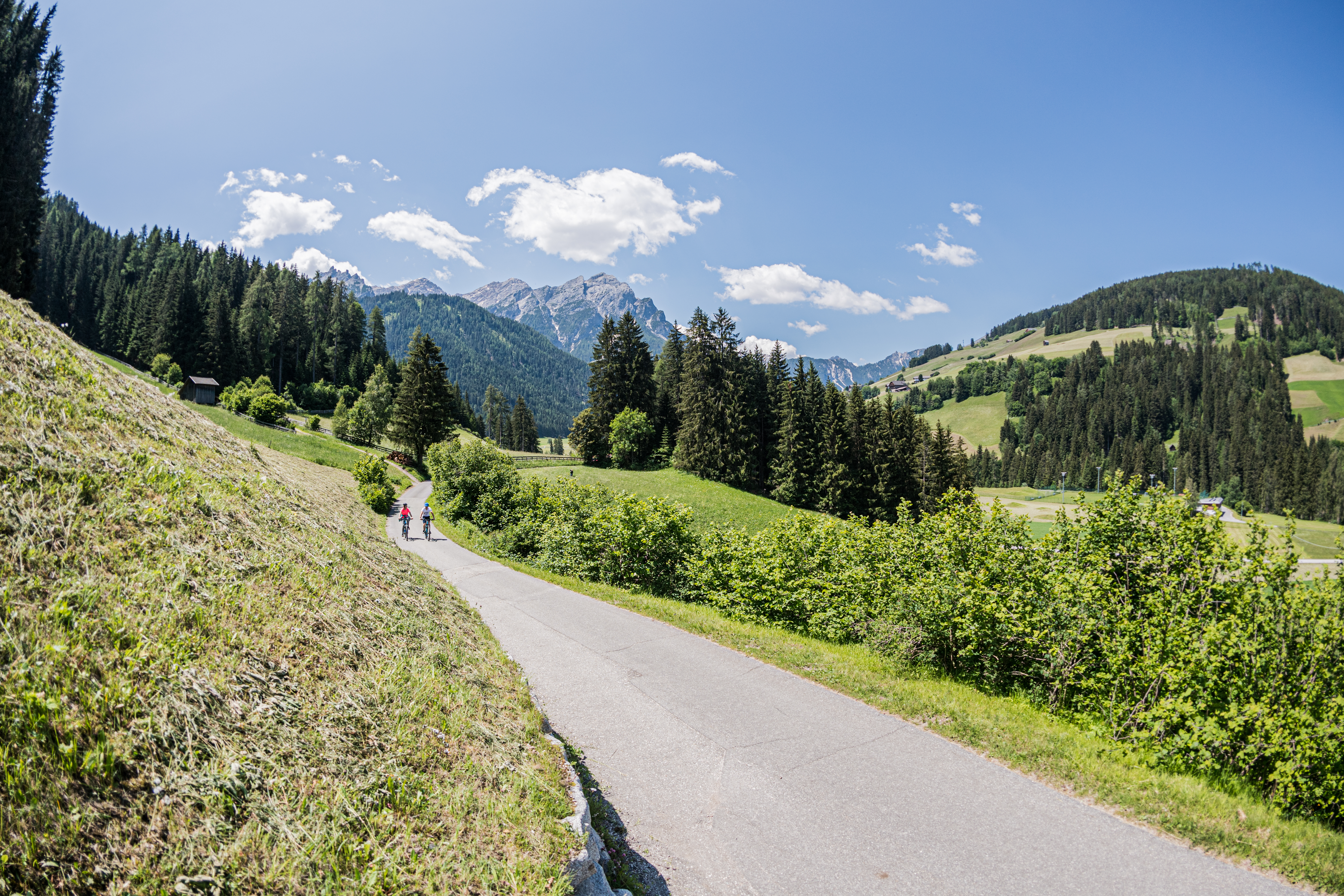 <Die anspruchsvollere Variante führt Sie zunächst ins Pragser Tal. Hier können Sie einen Abstecher zum idyllischen Pragser Wildsee machen. Die Etappe führt Sie auf das Hochplateau Plätzwiese, über welchem der Dürrenstein und die Hohe Gaisl majestätisch thronen. Anschließend geht es über die alte Militärstraße bergab ins Höhlensteintal und über die alte Bahntrasse „Ferrovia delle Dolomiti“ über den Cimabanche-Pass in die Olympiastadt Cortina d’Ampezzo. Die leichtere Variante führt direkt über den Bahntrassenradweg durch das Höhlensteintal nach Cortina d’Ampezzo.