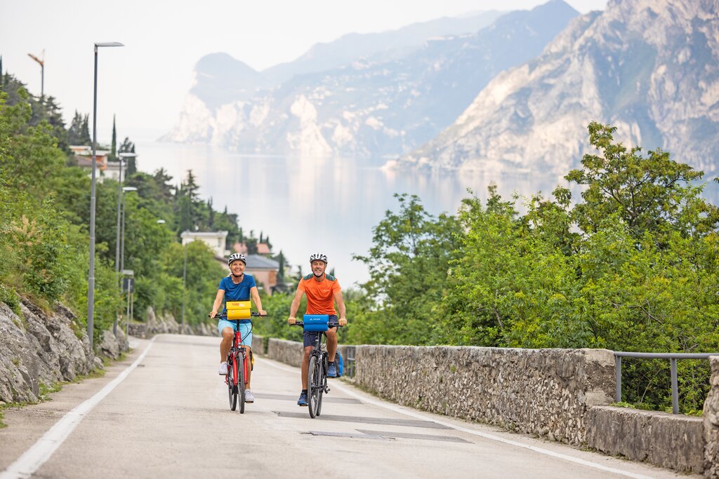 <Sie verlassen das Ufer Richtung Etschtal. Dabei genießen Sie nochmals herrliche Ausblicke über den See und folgen der Radstrecke durch Olivenhaine und Weinreben. Am Etsch-Radweg rollen Sie dann gemächlich nach Norden, immer begleitet von unzähligen Obstbäumen. Bereits in Mori verlassen Sie wieder den Fluss und fahren über den Passo San Giovanni nach Torbole oder weiter nach Riva. Kurz bevor Sie wieder den Gardasee erreichen, bietet sich Ihnen nochmals ein atemberaubender Ausblick über den See und das Sarcatal.