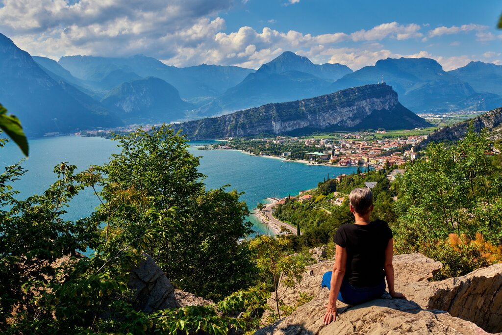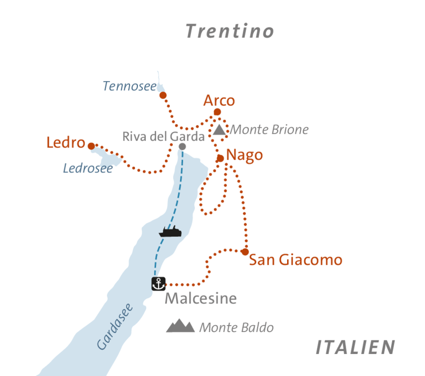 <Die heutige Wanderung führt dich entlang von Gletschermühlen und durch Olivenhaine talwärts zur Ortschaft Torbole am Nordufer des Gardasees. Entlang der Seeuferpromenade wanderst du bis zum Ortseingang von Riva. Von dort geht es bergau auf den Monte Brione – einen markanten Hügel mit Panoramablick über die gesamte Nordbucht. Der Weg führt durch Olivenhaine und an alten Festungsanlagen vorbei, Relikte aus der Zeit der k.u.k.-Grenzbefestigungen. Am Nachmittag bringt dich ein Transfer hinauf in das Gebiet des Monte Baldo, wo du dein nächstes Quartier beziehst – ein ruhiger Kontrast zur Lebendigkeit des Sees.
