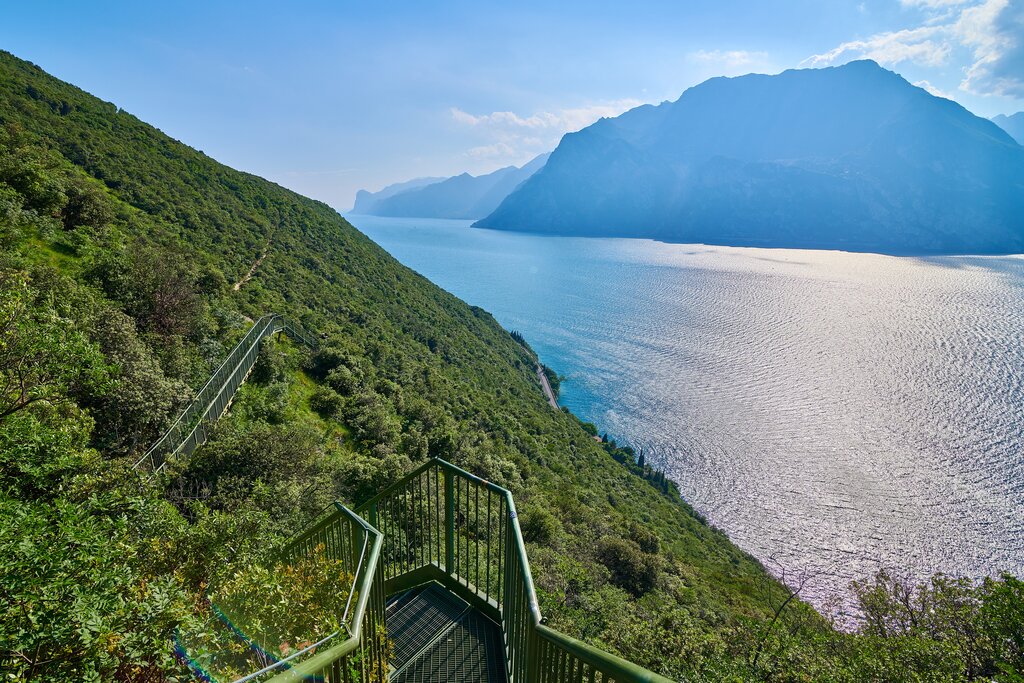 <Heute erwartet dich eine der schönsten Panoramatouren Norditaliens. Du wanderst entlang des Ledrosees, dessen klares Wasser zwischen grünen Hängen funkelt, und steigst anschließend auf den bekannten Ponale Panoramaweg – ein historischer Felsenpfad mit grandiosen Blicken über den Gardasee. Langsam öffnet sich der Blick auf das tiefblaue Wasser, bis du schließlich das Seeufer von Riva del Garda erreichst.