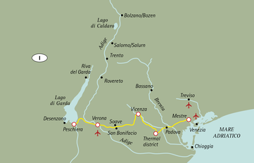 Diese Radtour beginnt in der kleinen Stadt Peschiera del Garda und führt Sie vom atemberaubenden Gardasee bis ans Festland von Venedig. Unterwegs haben Sie die Gelegenheit, die Schönheit historischer Städte wie Verona und das noch etwas verborgene Vicenza zu bewundern. Sie radeln durch eine malerische Landschaft mit alten Villen und durch das üppige Grün der Euganeischen Hügel, bevor Sie Mestre erreichen, von wo aus Sie das bezaubernde Venedig leicht erreichen können.