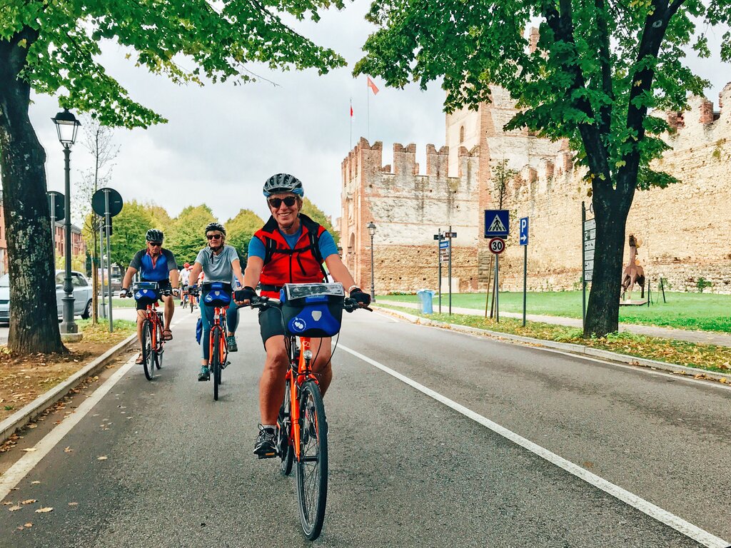 <Im Hinterland von Verona radeln Sie am Fuß der Lessinischen Berge entlang, wo Sie in Mitten der Weinberge auf die Burg von Soave treffen. Die flache Strecke (+425 m/-435 m) bringt Sie an den schönen Schlössern von Romeo und Julia in Montecchio Maggiore vorbei, während die hügelige Strecke Sie durch die Berici-Hügel führt. Vicenza, das kleine Juwel mit den Bauten des Andrea Palladios, der einer der berühmtesten Architekten des XVI Jahrhundert war erwartet Sie am Ende des Tages. Die Etappe kann dank des Bahnhofs in San Bonifacio verkürzt werden.