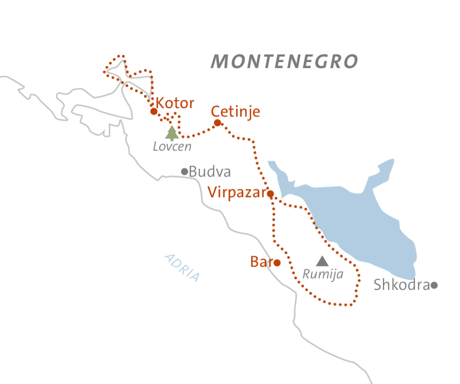 Entdecken Sie die wilde Schönheit Montenegros mit dem Fahrrad. Die Tour bringt Sie zu den Höhenpunkten der montenegrinischen Küste und des Nationalparks Skadarsee. Sie durchqueren verschiedenste Landschaften, immer begleitet mit wunderschönen Panoramablicken. Sie übernachten in kleinen Familienhotels in den zentralen Orten, in denen Sie in guten Restaurants den Tag ausklingen lassen können. Ihr Gepäck reist unabhängig von Ihnen von Ort zu Ort. Ihnen bleibt der Genuss am Radfahren, der Kulinarik und der vorbeiziehenden Landschaft Montenegros.
