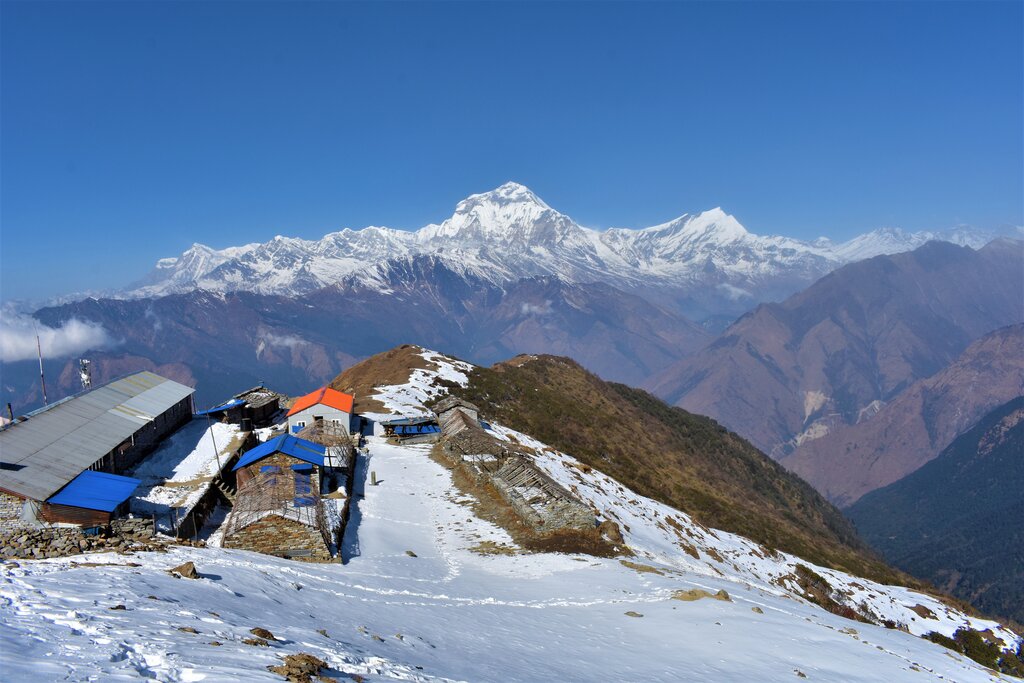 In Tadapani erwartet dich ein erholsamer Abend in einer idyllischen Waldkulisse mit Rhododendron-, Magnolien- und Eichenbäumen, umgeben von majestätischen Ausblicken auf den Machhapuchhre und den Annapurna South.