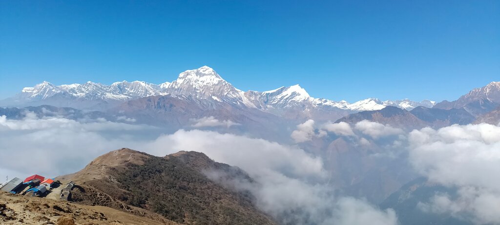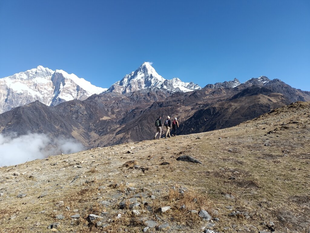 <Starte früh, um die beeindruckenden Ausblicke auf das Annapurna-Massiv und die umliegenden schneebedeckten Gipfel zu genießen. Nach einem herzhaften Frühstück in Ghandruk wanderst du bergauf durch Deurali und wunderschöne Rhododendronwälder, bis du schließlich Tadapani erreichst. Der Weg bietet eine malerische Landschaft, und im Frühling kannst du Hügel sehen, die von blühenden Rhododendren bedeckt sind.