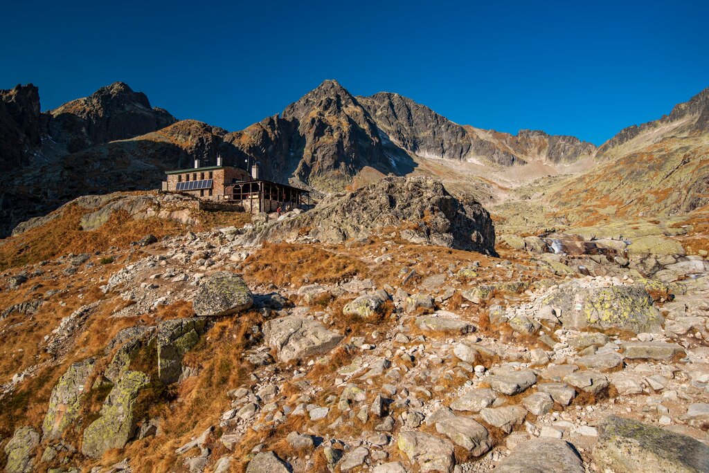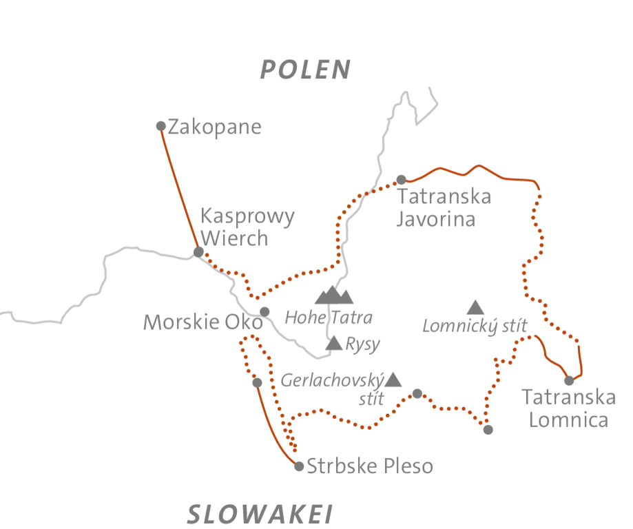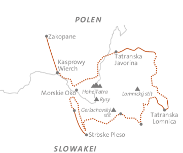 <Mit der Seilbahn fährst du hinauf zum Bergsee Skalnate Pleso (1.754 m), am Fuße des zweithöchsten Gipfels der Hohen Tatra, der Lomnitzspitze (2.628 m). Vom Skalnate Pleso führt dich der Tatra-Trek nun in den felsigen und alpinen Teil dieses kleinen Hochgebirges bis hinauf zur Berghütte Téryho chata (2.015 m). Die gewaltige alpine Szenerie rund um die Hütte wird dich beeindrucken. Nach einer verdienten Rast wanderst du zum Hrebienok. Mit der Standseilbahn geht es von hier hinunter in den bekannten Tatra-Kurort Stary Smokovec. -